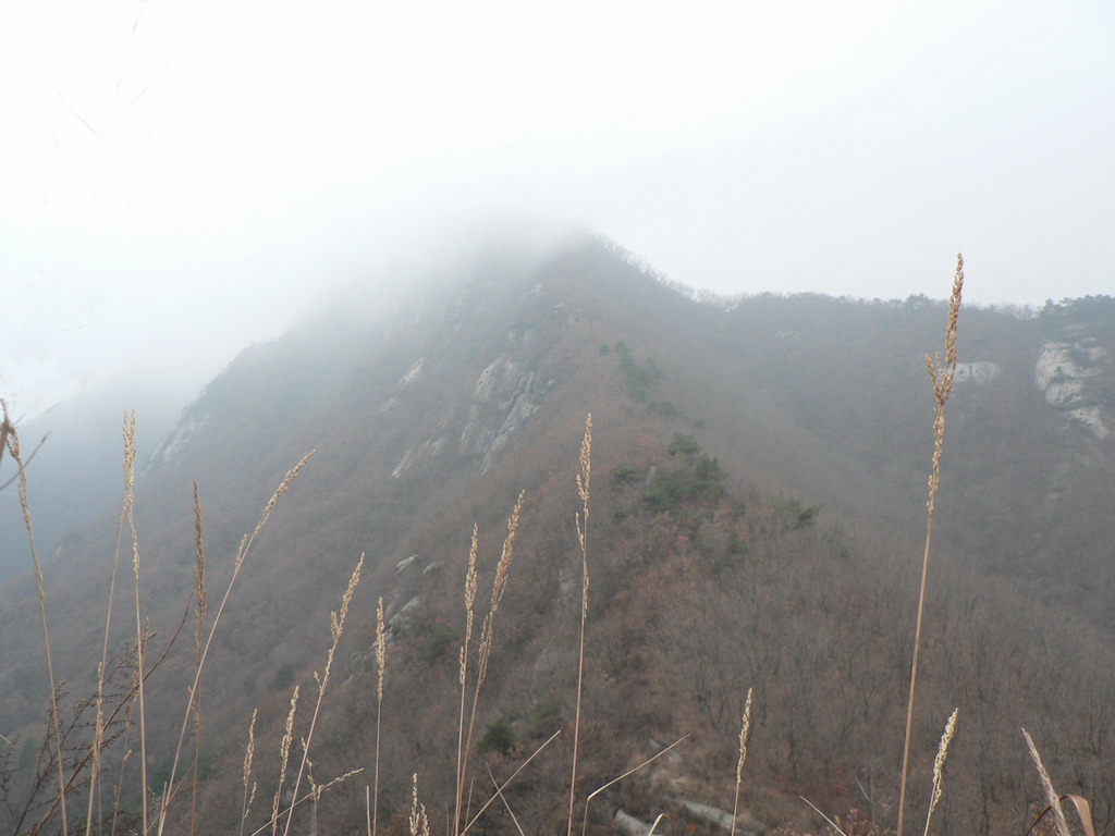 经过一段比较陡但不是很漫长的上升,我们走到了舒畅的山脊线上,我真爱山脊线哦~~两条腿可以平行着走路,呵呵。山体沿着山脊线向两侧绵延开去,已经是深秋了,山上的树们已经褪去了绿色的盛装,叶子们都落回地上冬眠、轮回,山体更加的酋劲,带着淡淡的灰。而雾气,也在山与山之间升腾徘徊。鲜亮的是这些兴致勃勃的驴子们,在灰色的山和雾中生动着。
