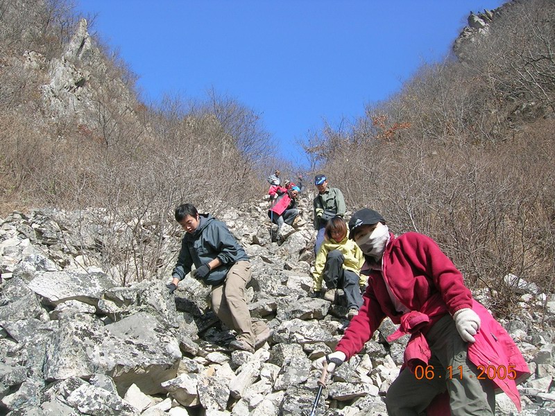 吃过午饭后1点开始下山,从顶峰东面的一条类似老黑山的乱石冲沟下山,但是石头小34倍,所以更不好走,下到沟低后,向西翻过2个山脊,终于上了正路。 wzUhP4hL.jpg