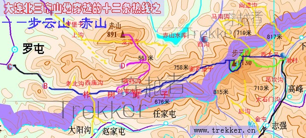 总结:这是第二次登步云山了,感觉还是南坡的路比较难爬。而且只有把步云山和赤山连起来,才能算一条比较完整的两天线路。走到赤山可以从F点上公路,也可以登顶赤山后从原路返回,从西庙沟南面的山路翻越山梁到赵家屯上公路,