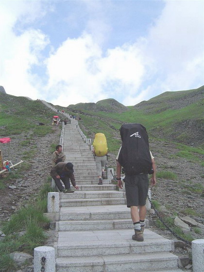在我们出发的时候,看见有一支队伍从我们昨天下坡的山路下来,一看就知道是韩国的穿越队伍,而且年纪应该都比较大。闹闹本来无精打采的,但是一听韩国老太太来了,非要走在最前面,生怕被她们追上。这下可苦了我和老赵大哥,闹闹这时的上山速度就坐了火箭,蹭蹭往上窜。走了一段后,我和老赵大哥实在跟不上了,就告诉闹闹队伍还有韩国帅哥,这招还真管用。闹闹听到有韩国帅哥,马上就走不动了,非要等等,呵呵!