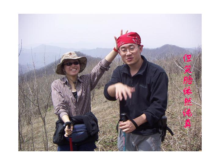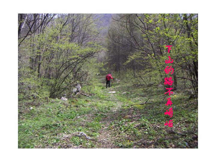 花絮2:飞鸟教MM们下山。飞鸟系本次活动领队,金庸称之为“带头大哥”,不过我看这只鸟倒有令狐冲风范(不许呕吐),大包,走风潇洒、随意。下山途中,大家速度不一,时不时有人滑倒,领队飞鸟看在眼里急在心上,速速指点,几个示范下来,兄弟姐妹们收益菲浅,眼看山脚在即,只听得“啊呀”一声惨叫,飞鸟腾空而起,一个屁敦。在哪儿跌倒就在哪儿爬起来,飞鸟健步起身,“啊呀”,又是一个敦,还滑出3、5米,再起,再摔,如是者三。登时欢笑声雀起,把下山的疲劳都忘在了脑后。飞鸟,I服了YOU ,不愧为领队,真会调剂大家的情绪啊。行走,土路,到汤沟,出公园正门,一起去泡当地久负盛名的温泉。