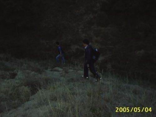 2005年5月3-4日,泡崖一行人员在文哥的带领下到李官洗温泉,4日早3:00文哥、好好先生、宝宝、暖暖、林林、宝石节一行六人从龙门汤宾馆出发,一路强行军1小时来到长白山脉支脉——海拔878米的老帽山角下,开始了我们的攀越之行,那天天气不错,能见度很好,可是困难还是比我们想像的多,在向老帽山主峰冲刺的时候要接连穿过四座小山脉,这消耗了我们大量的时间和体力,本想赶在日出前登上顶峰,可是紧赶慢赶,太阳还是在距我们离顶峰有段时间的时候出来了,不得以我们只好停下来看完了日出的全过程,说实话还是很美的。