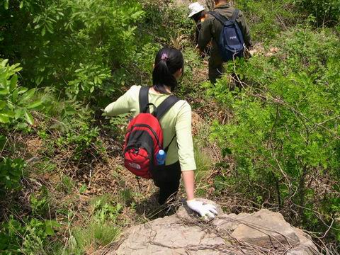看照片颇有感触:大连地区大约以金州为界,以南地区的山上多山枣刺、荆棘类植物,夏天扎皮肤、冬天挂衣服,十分讨厌。建议带把类似砍柴刀样的工具,可以安排男生轮流在前面开路,这样可以大幅度地减少大部队的受伤。