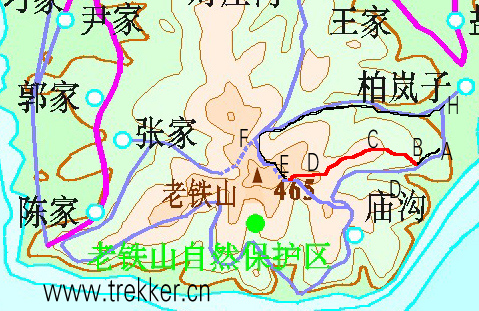 下边图中紫红线是柏油公路,淡蓝色线是山中的水泥盘山路,其中虚线部分是高山隧道,大红色线为这一次我们走过的山脊,淡蓝线边有一条细黑线的是这一次我们走过的水泥路。