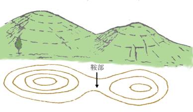 鞍部:图上用一对表示山脊和一对表示山谷的等高线显示(见图) 。