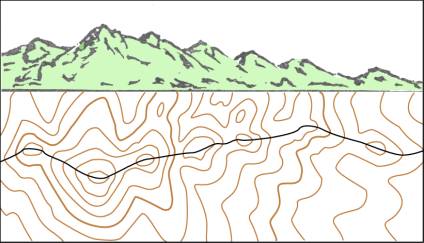 等高线是指地形高度的差距。他们表示哪里有山,哪里有坑谷以及地形的陡缓。在很多公园图中,等高线较少;但也有很多其它公园和森林图中,等高线较多,且高度各异;因此,读懂等高线很重要,因为它在很大程度上影响你的路线选择。相邻两条等高线之间的距离在地图上用等高距表示,通常为2-5米。不同地图,等高距不同。同一幅图上只采用同一等高距。等高线显示地貌的特点:一是在同一条等高线上的各高度相等并各自闭合;二是在同一幅图上,等高线多山就高,等高线少山就低。等高线间隔大的坡度缓,间隔小的坡度大;三是图上等高线的弯曲形状和相应实地地貌的形状相似。如下图所示: