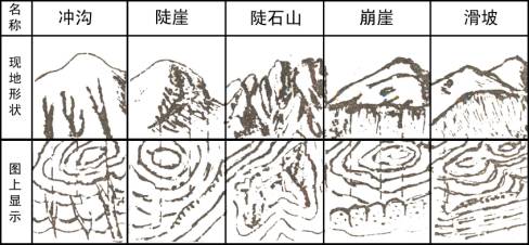 特殊地貌:是指等高线无法显示的地貌。在地图上用特殊符号所示的地貌,如变形地、岩峰、露岩地等(见下图) 。