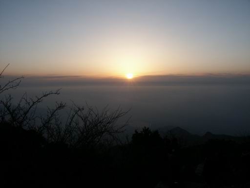 迷迷糊糊中有人在走廊里喊:五点了,看日出了~前一天晚上得到的时间是6:20起床就可以。但是走廊嘈杂起来,索性起来。走出房子,哦,冷呢,即使有军大衣。抬头看,很亮很亮的月亮,虽然是半个,已经很亮。想起那句《白月光》:“白月光,心里某个地方,那么亮却那么冰凉,每个人都有一段悲伤,想隐藏却欲盖弥彰”。