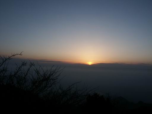 迷迷糊糊中有人在走廊里喊:五点了,看日出了~前一天晚上得到的时间是6:20起床就可以。但是走廊嘈杂起来,索性起来。走出房子,哦,冷呢,即使有军大衣。抬头看,很亮很亮的月亮,虽然是半个,已经很亮。想起那句《白月光》:“白月光,心里某个地方,那么亮却那么冰凉,每个人都有一段悲伤,想隐藏却欲盖弥彰”。