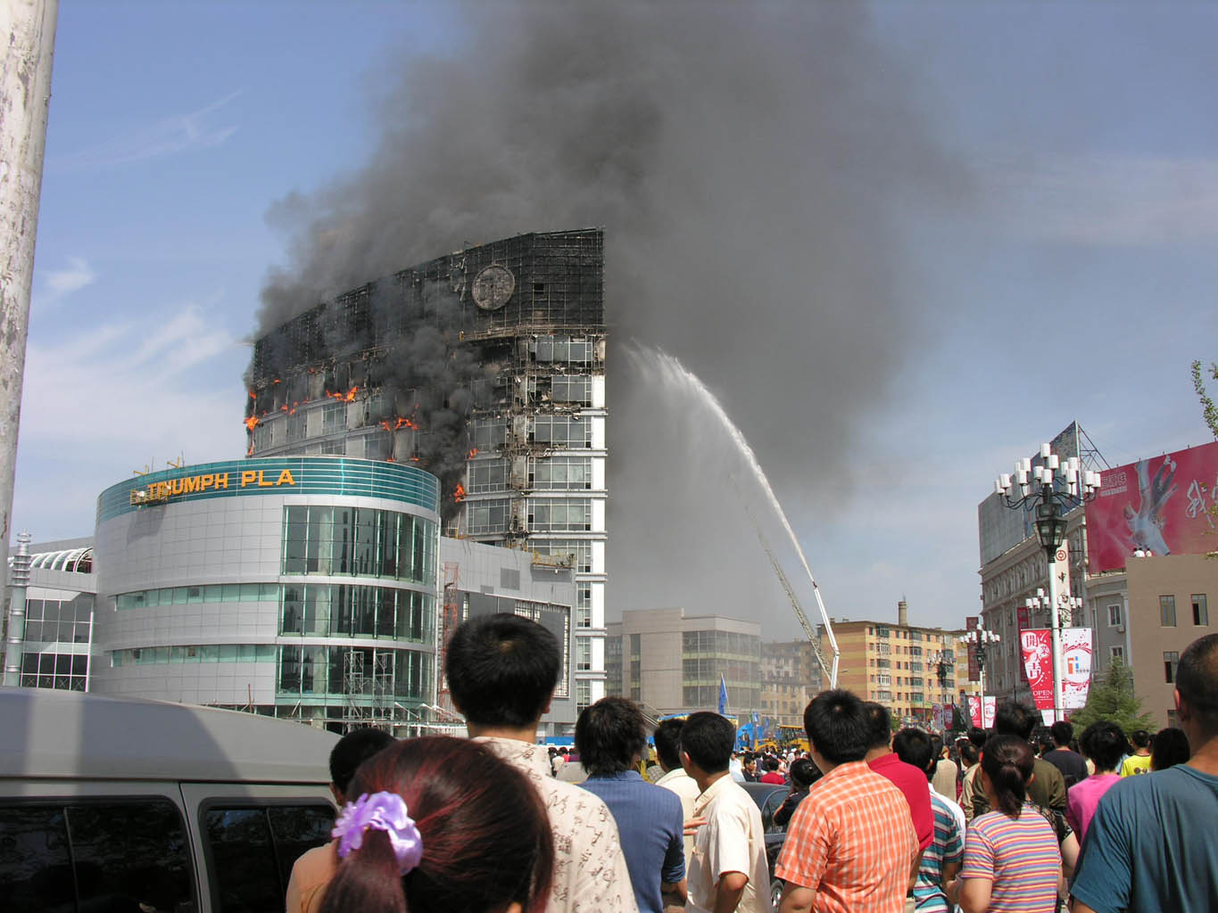 出来时看见整个大楼的上半部分都被烧得面目全非了,不过当时火己经熄灭了。