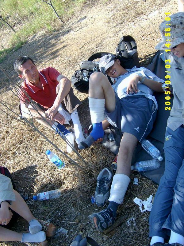 又是一个小时,队伍在一段正在修路的道边沐浴着尘土休整,脱鞋看脚,惨,水泡已经豁然贴在脚上… … …事后总结:我30公里以上的徒步走过不少,时速一般保持在四公里左右,脚上出水泡的机会并不多,这次有点盲目跟快了,而老布他们没有任何问题,看来每个人都有自己的极限节奏,超出这个范围,嘿嘿,等着痛苦吧)。
