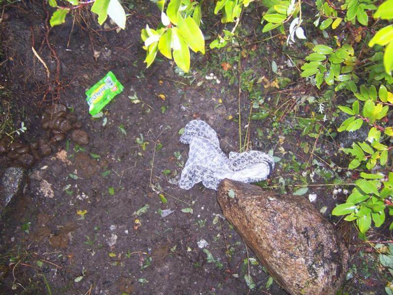 还有大量的图片这里就不一一展示。 对于这帮自称为驴的人,我对他们表示强烈的鄙视和厌恶。首先指着活动的组织者,作为组织者,没有着对自己和队伍能力的正确认识,没有对队伍的组织和控制能力,造成一个慌乱的活动场面,并对自然环境造成了伤害,也伤害到了自身的声誉。还要指责这支队伍的成员(不排除有注意了收拾垃圾并自行带下山的人),谴责这些自私的家伙,营地上的诸如深夜影响其他队伍休息的小事不提,这里就只说垃圾,能带上来,难道就没有能力带下去?况且,我看到的是你们的行李都是雇佣了马匹的,包括上山和下山,为什么不能带下去,为什么对于其他人的善意提醒置若罔闻?难道你们不知道你们留下的电池、酒瓶、塑料袋、内裤、塑料拖鞋是在你的有生之年都可能不会自行降解掉? 我写下这些文字谴责这次我碰到的这些重庆队伍,我不针对重庆人,我队也有一位队员是重庆人,是成电的在读研究生,在这些我们所憎恶的重庆队伍下山后,他,默默的和我们其他几位队员开始搜集营地周围的垃圾,并在后来的几天时间里,时刻不忘收拾路边的垃圾。 我不知道为什么有人喜欢把自己称作是驴,在我的眼里,这些驴和畜生已经没有区别。