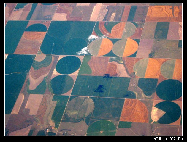 bobo说的对,美国(外国)大农场。圆的是因为灌溉设备是圆周运动。所以田是圆的。全面机械化的结果。