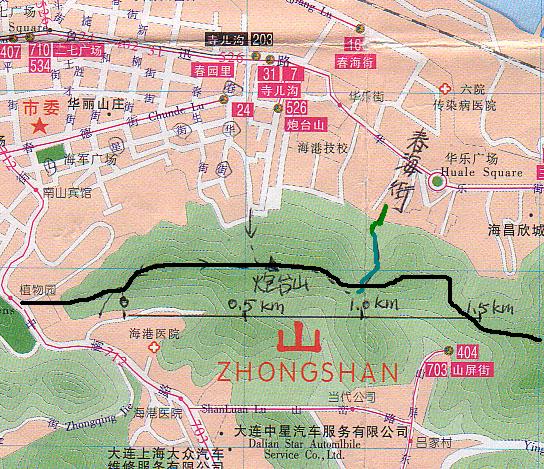 行程安排:   2004年11月6日天气可真好,四个字儿:秋高气爽!连报纸都说适合室外活动。  9:30 我们一行三人(静石、灵石、王子)乘712路到达植物园车站,顺天蕴加油站左侧上山,登了几分钟,蓦然回首, 豁然开朗!大连港就在前方,高楼大厦已在脚下。风将雾气一扫而光,远处的大黑山清晰可见,不时有飞机从海港的上空经过,天和海格外的蓝,真是一番好景色。。 美! 10:30 炮台遗址 炮台已经没了,几个圆形大坑,结实的兵营,走进兵营,里边居然有两层,岁月已久却几乎没怎么损坏。而外边的营房虽说是断壁残垣,但也能分辨出个外形和大小,只是时间过于久远,屋内的树已经很高了,,据说这是日本人建的。不知为什么这么好的侵略罪证为什么没人保护,日本人也真会选地方,架上几门炮,就很容易控制大连港了。,这就是炮台山的来历?气! 继续向前,经过了一大片坟地,也许这里的风水过于好,依山看海,坟占满了整个一面山坡。连山路也在坟堆中绕来绕去,下了山坡,又是另一个山峰。 11:30,海昌欣城的正对面 从山上看,你很容易看出设计的师的构思,整体左右对称,象塔形一样。向南望去,能看到山屏街上迎宾路的桥。据说规划中的这儿有个隧道,将海昌欣城与山屏街相连,然后通过跨海大桥通向开发区。继续向东。 11:45,午餐 席山顶而坐,眺望着大海、来来往往的船只,两只老鹰在空中盘旋,不时听到山鸡的叫声。今天的午餐别有一番味道,尤其是老婆作的饭团和紫菜卷饭,加上满山的秋色,绝! 12:15分 再出发!继续向东 心中的海之韵一直藏在山后看不到,激励你去征服下一个山峰。向南边也可以看到海,应该是付家庄到老虎滩之间的海,云的影子落在茫茫海面上,就像一马平川。壮观! 13:00 海之韵的雕塑从山角处露出。 13:15 将海之韵的悬崖踩在脚下。以前都是从下往上看,这次从上往下看。一种征服感油然而生。爽! 13:25从海之韵婚礼殿堂的左侧顺利到达地面。耶! 我们免费观光了海之韵后,打道回府睡觉喽。香! 王子是我们的专门摄影师,今天的美景全收在他的相机内。老兄,辛苦了! 穿越时间:整个线路用时大约4个小时。 线路地图: