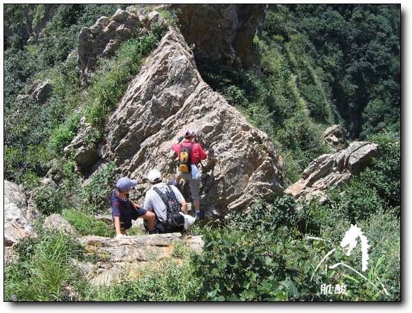 8月20日,我们一行4人(其中最小的那个是我的儿子,13岁)从大黑山东侧类似奔儿头的山脚下开始登山,60多度的山坡从9.30分开始爬到山顶时已经11.30分.休整补充能量后,开始穿越"刀背".在穿越"刀背"后继续行进的下一个山峰处,遇到欢声笑语的一只队伍,看样子是要在山上宿营.一打听,原来是"穿越者".哈哈,大鱼做了自我介绍,我也报了自己在"穿越者论坛"注册的网名,虽然没有参加过"穿越者"的活动,但也算是在论坛上经常拍拍砖了,并不陌生.希望有机会一起进行穿越.