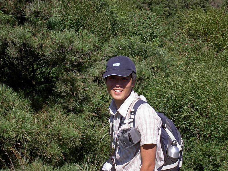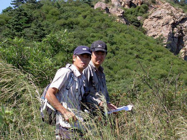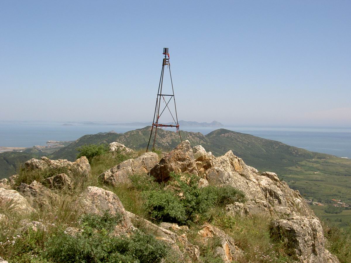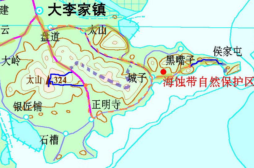 线路简介:太山高度为324米,是大连300米以上的高山之一;城山头是海蚀带自然保护区,两者从图上看不远。 参加人员:候鸟、灵石、静石  行程安排:2003年9月3日早晨乘坐大连-正明寺的客车6:00准时从北岗桥车站出发。经过开发区董家沟、大李家到正明寺。8:20在大李家与正明寺之间的山坡上下车,可能也是老九他们上次下车的地方,只不过,这次我们是向西,顺着一条机耕路很快到一建筑物附近就没路了,再向上的路就如同进入了原始森林,高高的野草,纵横的藤蔓,满山的野胡椒树,横在头的马峰窝,就是走到了山脊上也没有路,就在这种状态下,我们三个人穿越了3个时,在接近主峰时,终于有了我们盼望很久的小路,看得出来,这小路也是有人刚“修理”过的,砍倒的草还放在路边。路通向了一个军事设施--山洞,没头灯,没进入太深。 11:30左右到达主峰,一个明显的三角架,午饭后,想顺着山脊下,但没找到路,不想再进入“原始森林”受罪,顺着通向山洞的山坳中的小路下山。到达通向正明寺的公路上,有个“液化气站”字样的路牌。 太山穿越又丰富了穿越经历,面对绿色的屏障,第一次有了匍匐穿越的经历;第一次看到那么多的马蜂窝,3个小时在荆棘中穿越也是第一次。感觉此山平时根本没人上,因此山脊上也没有路,唯一的一条路是从南北两个方向通向山洞,继而到主峰,通向北侧的路估计也是从大李家的山坳中过来的。走山脊线的经验对太山不好用。小小的太山耽搁了太多的时间,穿越东面山脊再到城山头的计划不得不改了。 14:30分左右在正明寺租辆三轮车,向城山头进发,图中虚线部分是乘车线路,城山头的风景确实不错,可惜现在被开发为海参养殖基地了,本来想顺着海滩绕一圈,但被养参人大声喝止,没办法只好走到山顶,那个上了锁的大铁门和“军事设施禁止入内”都是虚的,军队早就撤了,旁边一绕就过去了,不过岛上确实能看出来驻军的烙印,很深的山洞,观察哨(有黄海第一哨字样)、营房,营房已经被翼龙户外“占领”,训练场地也同样成了翼龙户外的野外扩展场地。没有太多的时间,没有找到从山上下到海滩的路。 天气很好,可以很清楚的看到鸟岛和广鹿岛,而那著名的海蚀线,只能在山上远观了。感觉到在经济利益的驱动下,海参养殖正在一点点将海蚀线吞没了。 16:00租车到大李家,然后乘小公汽到保税区轻轨站,乘轻轨返回市内。 探索新线路得有砍刀和头灯,这次如果有砍刀也许会省些力气,如果有头灯的话,可以探探那两个山洞。 庆幸的是本次活动报名人数幸好不多,否则上午的那3个小时根本没法带,租车也是难事,都市飞鸟说的对,小部队活动比较好。 穿越时间:除去吃饭和乘车时间,大约6个小时。 线路地图:蓝线是穿越线路。黄虚线是乘车线路,蓝虚线是老九上次的穿越线路。
