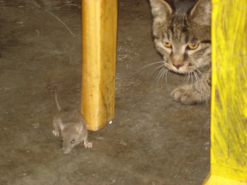 真实版的猫捉老鼠,呵呵,长这么大地一次看见小猫抓老鼠,兴奋得我饭也顾不上吃,拍了好久。虽然看着小猫一直把小老鼠折磨致死有点残忍,可是,还是很佩服这乡下小猫了,要知道城里的猫几乎都不抓老鼠了。。