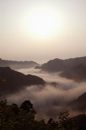 我站在山巅。太阳已照耀在层层叠叠、错落有致的群山,远山的轮廓在阳光的勾勒下重叠着,交错着。牛奶般的晨雾由远而近的飘逸流动。有风吹动树枝,沙沙的声音是布谷鸟吟唱的伴奏。静静的,我站着,那一刻,我没有因为未带相机而遗憾,最美的风景是流动的,它永远映照在人的心中,无法用像素呈现出来。因为那样的风景是与心相通的,共鸣的。