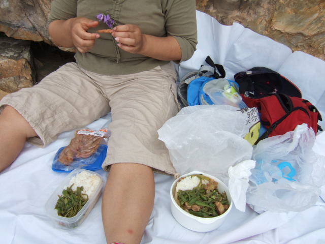 我准备的中午饭!只要是天气不冷,一般都是做好了带着!吃着更香! kWPeSNZS.jpg 老婆专心致志的啃她的鸡爪子! 只要有吃的,她就不会闹人了! lsr8ZfAM.jpg 吃饱之后,还要小憩一下! 多亏石头硬! 要不然一觉得睡到下午五点半!把我计划都打乱了!计划30分钟变成60分钟的午休了!