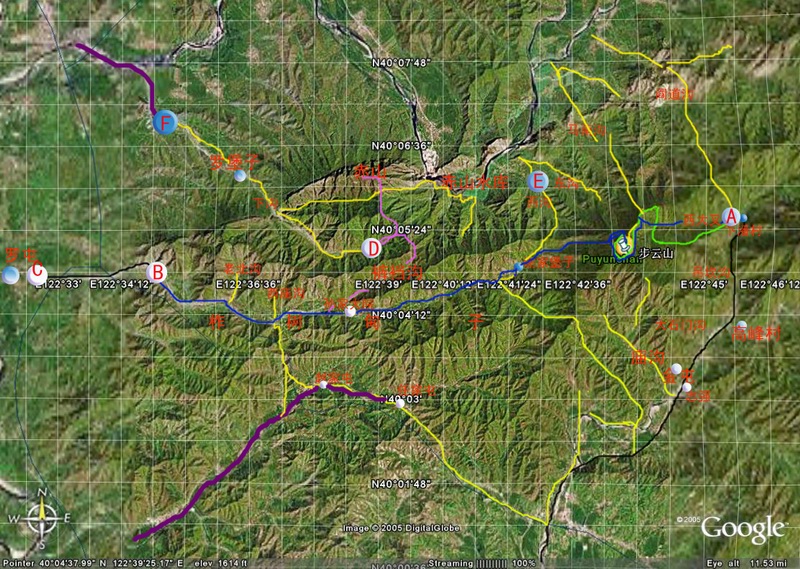 路线11日晚637分从大连发车,具体车行路线如《步云山公路图所示》。晚1040多分到达下潘村,把司机安排在农家后,11点左右开始沿下潘村北面的西大叉,向山里走,11点半,在路旁找到了一座废弃的农舍,决定在里露营。