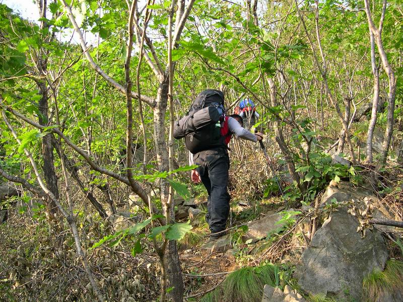 不走常规道路的代价就是走到没有路,前面巨石挡道。这是主峰下九百米左右海拔的地方,山脊处出现了一段八九十度的断面,等队伍全都走到崖下时,我们的前队飞狐和alian已经负重翻到了石头上面。 也是在这个时候,nicole第一次让她的尖叫让我感到了恐惧。美女花容失色,好在有惊无险。 两位领队和alian希望继续,于是顺包,再逐个人轻身攀上石崖。 其实,危险并不在于地段的本身,而是在于危险到来后而我们却没有察觉。 胆大心细,应该是户外活动的基本素质。决定下来走这段石崖后,就没什么担心了,队伍小,人员熟,没有谁特别隔路、没谁特别娇惯、没谁特别笨拙。大家齐心协力,很快的顺利地通过了这一段危险的路段。这样的队伍,这样的人数、这样的组合,恐怕也是领队最最希望的吧。