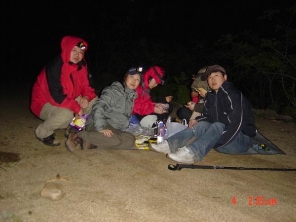 也就是在这样FB之后,晚餐过后再众MM的再三要求之下,我们开始了夜登步云山。可能因为俺比较馋,记得当时大家好像都没剩下什么吃的,就俺一个人带上了一些零食,还有ZY的炉具,咖啡。。就这样我们从步云山乡上路了。真是不走不知道,大约11点出发,在大家问了无数次“到了没有”,到最后已经麻木地走到步云山脚下,大概经历了3个小时。下半夜2点钟,正是夜黑风高,大家饥寒交迫的时候,我们在一棵大树下赏月进食取暖。。。