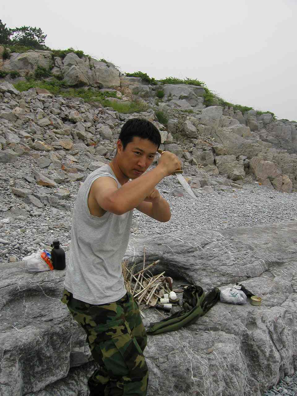 野外生存活动应广大同好的要求终于在这周成行了,由于周日酷兵营有战斗任务临时退出,两名队员因伤,一名队员因事不能参加,所以本次活动只有我和大胖两名队员.本次活动演练了山地和林地穿越,伪装,野外生火(不是用打火机等火具,使用了某种化学方法),野炊,海边取食,烤肉(不使用烧烤用具)等科目.